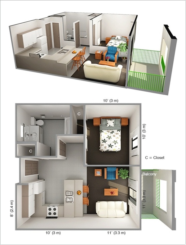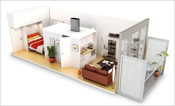 Căn hộ này khá nhỏ nhưng nhờ hình dáng vuông vức nên khá dễ bài trí. Trừ khối không gian tắm và tủ quần áo ở góc được thiết kế riêng biệt, các khoảng không gian trong nhà đều là không gian mở. Phòng ngủ được đưa ra gần cửa sổ để đảm bảo sự thoáng đãng, chiếc ghế phụ ở chân giường vừa là nơi để đồ vặt, vừa có thể sử dụng là ghế ngồi. Bếp được phân cách với không gian còn lại bằng một vách ngăn lửng, bàn ăn nhỏ nhắn kiêm luôn bàn làm việc.