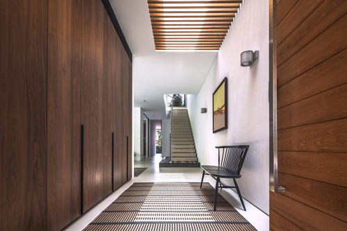 Hành lang rộng rãi, bố trí hệ tủ đựng đồ hoành tráng. Phía trên có cửa sổ trần đón sáng xinh xắn.