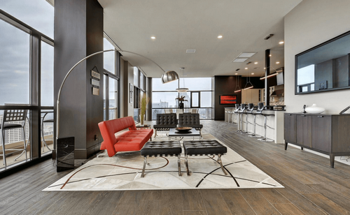 Sàn nhà chiếm diện tích đáng kể trong phòng, do đó bạn nên sử dụng những vật liệu sàn như gỗ, thảm trải khắp phòng khách và các phòng liền kề để tạo trực quan về không gian rộng mở hơn, cũng như tạo một dòng chảy cho thiết kế của bạn. Tránh sử dụng những đoạn có màu sắc tương phản trên sàn nhà.