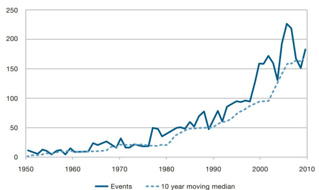 Số lượng các trận lụt được báo cáo trên toàn cầu. (Nguồn: Thống kê từ EM-DAT/CRED)