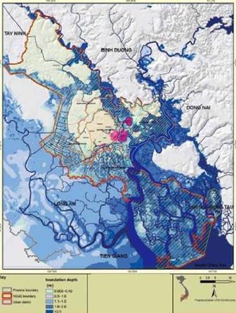 Các không gian phát triển của TP HCM nằm trong vực có rủi ro ngập cao. (Nguồn: Đánh giá dựa trên định hướng phát triển không gian của TP HCM và bản đồ dự báo ngập nghiêm trọng của ADB năm 2010)